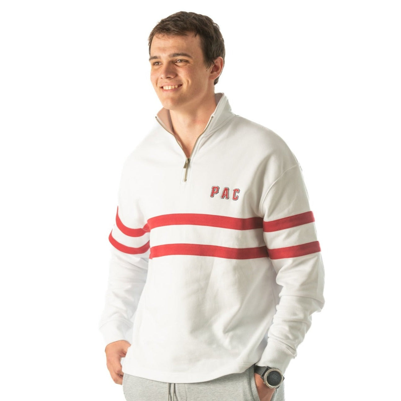 The PAC x ortc Collegiate Stripe Quarter Zip is made from a heavy weight french terry and garment washed to provide a super soft and relaxed feel. Featuring red stripe panels, signature PAC lettering, ribbed cuffs and a split hemline this top is sure to become a wardrobe staple.
